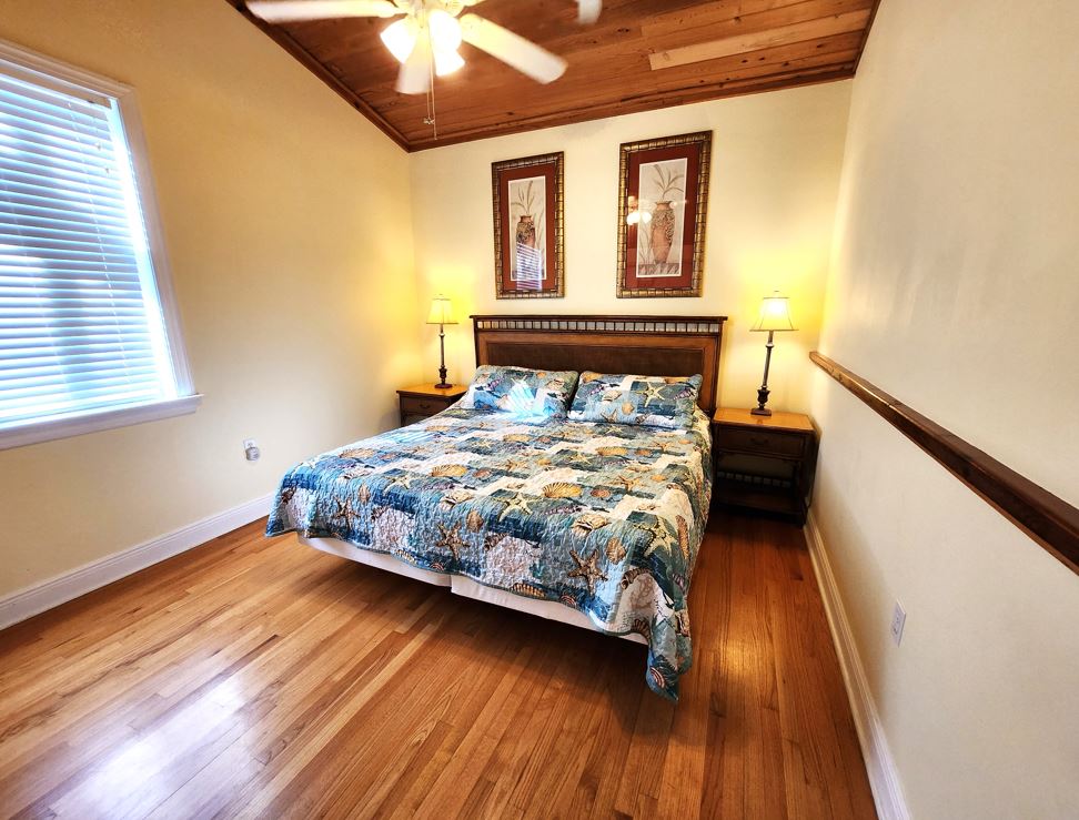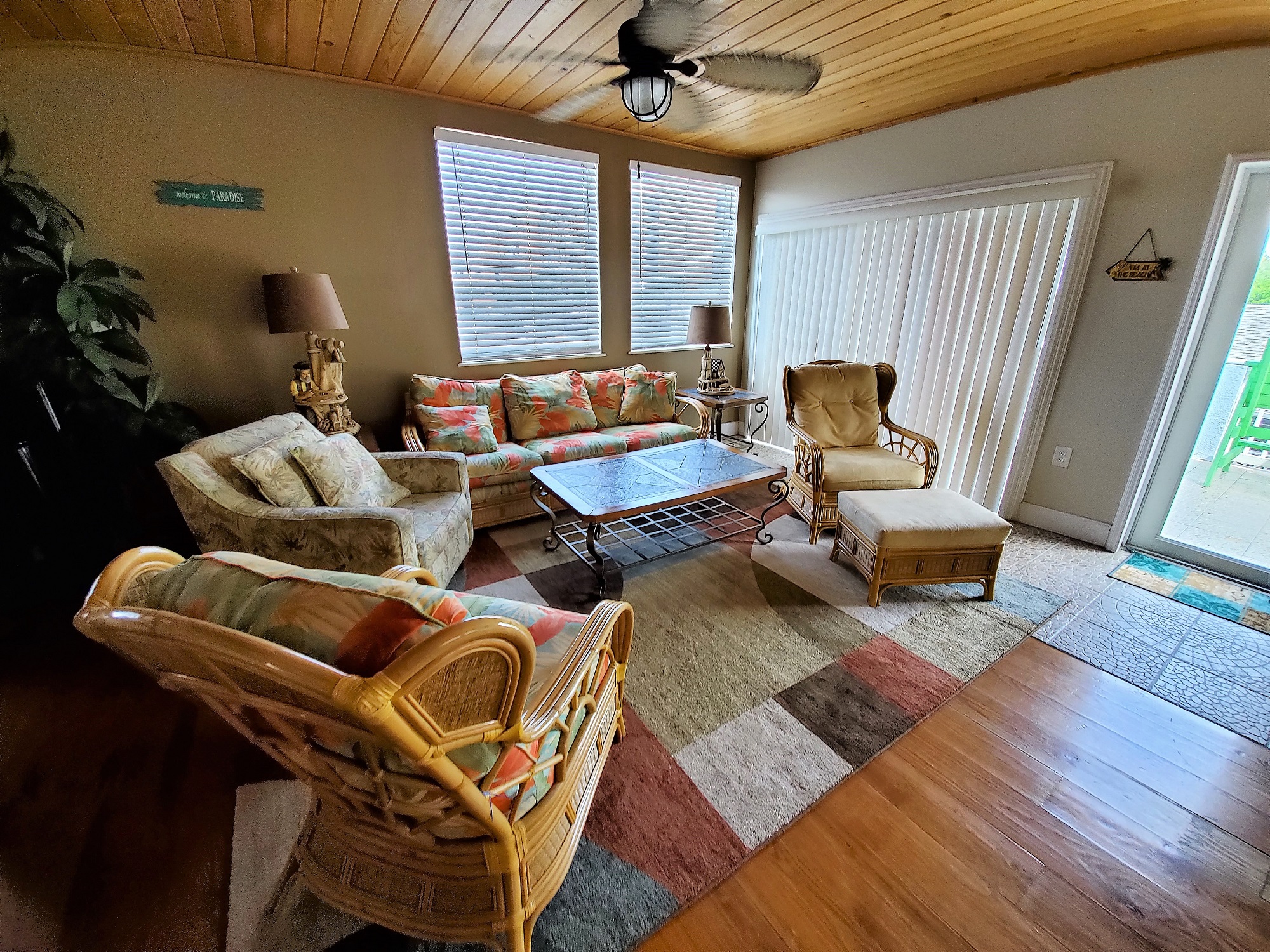 This unique multi-story Cocoa Beach vacation getaway is the perfect beach rental with panoramic ocean views and a unique floor plan on the upper level is real beach life. Enjoy the Ocean breeze on the multiple balconies or while you are relaxing at the pool in the brick-paved courtyard. The pool, courtyard and garden area are fenced in and landscaped for privacy. Enter the fully furnished and decorated Ocean View Tower through the glass door that opens upon the expansive great room of this unique vacation spot. Hardwood floors and elevated wood ceilings adorn both levels of this Ocean View Tower. The kitchen provides both a gourmet cooking area and seating for eight at the pub table and an additional four at the dining table. Sofa and comfortable chairs provide an easy view of the large television and also allows you to enjoy the natural beauty of the surroundings that this secluded dwelling has to offer. The lower level contains the queen size bedroom plus a full bath along with two sofa sleepers for four people in the great room. This level can sleep up to 6 guests.